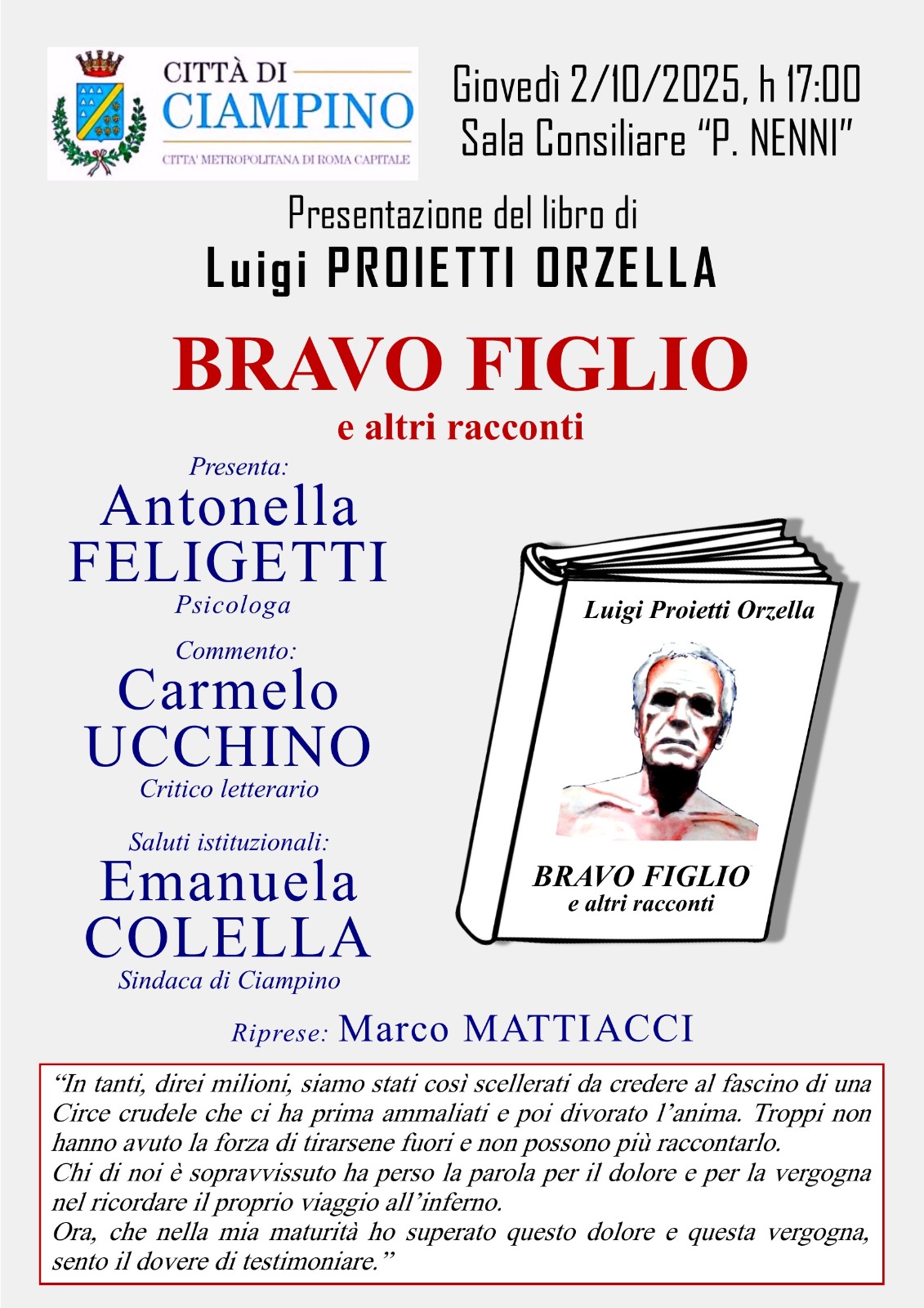 Nuovo appuntamento culturale a Ciampino. Giovedì 2 ottobre alle ore 17.00, presso la sala consiliare “Pietro Nenni” sarà presentato il libro di Luigi Proietti Orzella intitolato “Bravo figlio e altri racconti”.