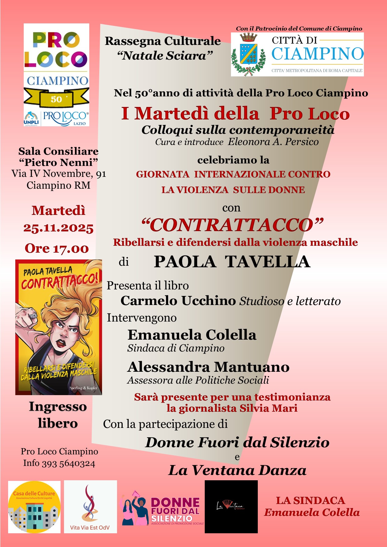 Appuntamento alle ore 17.00, alla presenza delle autorità locali, partendo dalla presentazione del libro "Contrattacco. Ribellarsi e difendersi dalla violenza maschile" nell'ambito dell'iniziativa I martedì letterari promossi dalla Pro Loco di Ciampino. Partecipano all'evento l'autrice Paola Tavella e le associazioni Donne Fuori dal Silenzio e La Ventana.