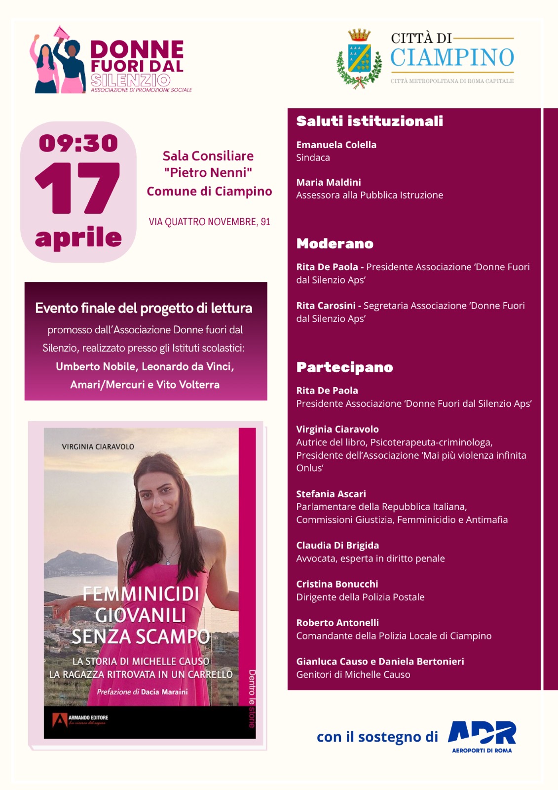 L'Associazione "Donne fuori dal Silenzio", con il patrocinio dell'Ente, organizza l'evento dedicato alla presentazione del libro di Virginia Ciaravolo intitolato "Femminicidi giovanili senza scampo. La storia di Michelle Causo la ragazza ritrovata in un carrello".