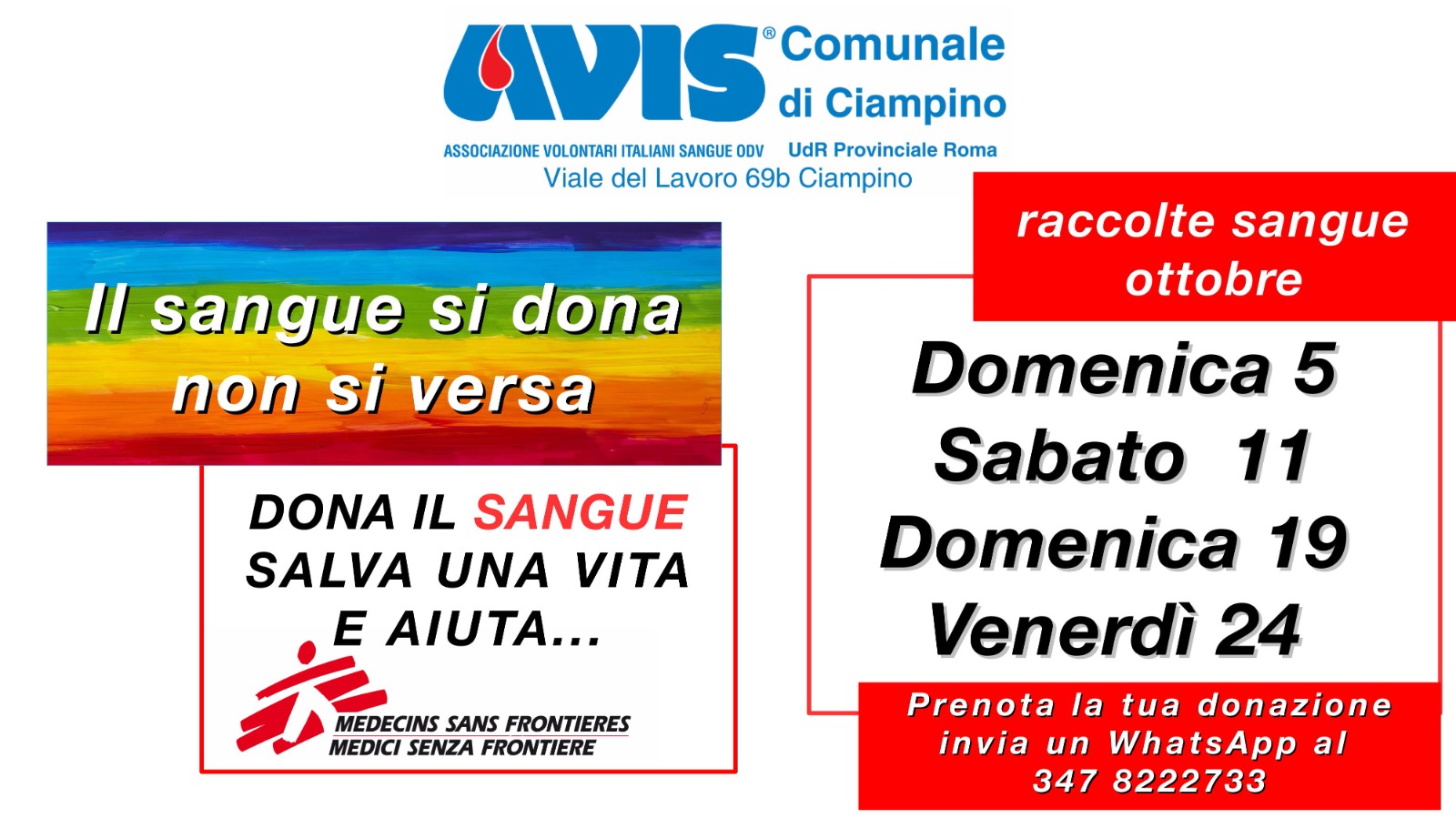 Si informa la cittadinanza che domenica 5 ottobre dalle ore 7.30 si terrà una nuova raccolta di sangue.