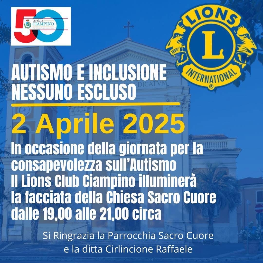 In occasione della Giornata Mondiale per la consapevolezza sull'autismo, mercoledì 2 aprile, il Lions Club Ciampino, con il patrocinio dell'Ente, promuove l'iniziativa "Autismo e inclusione. Nessuno escluso".