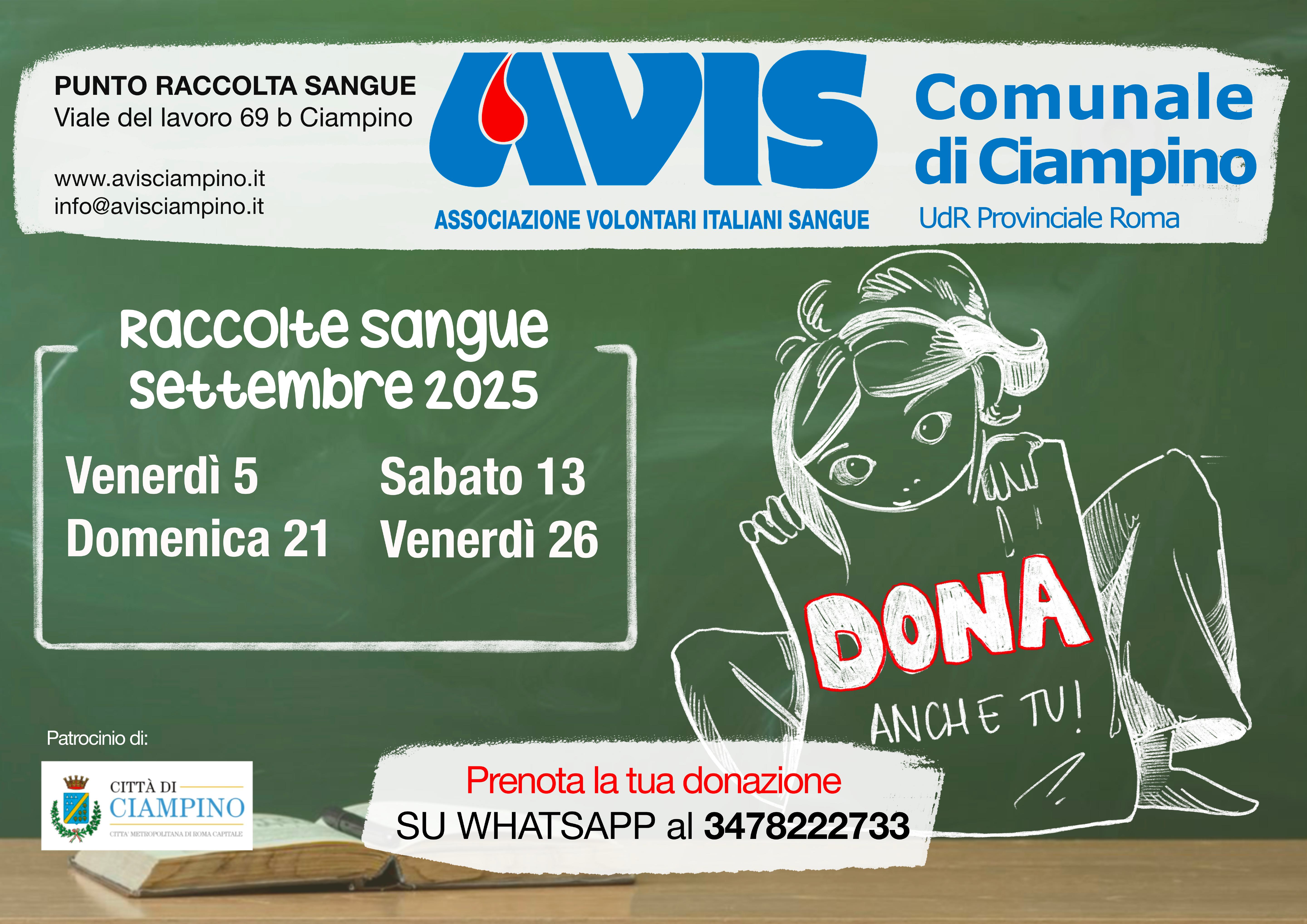 L'evento, organizzato da Avis Ciampino e patrocinato dal Comune, si terrà presso il Punto raccolta sangue di viale del Lavoro 69b Ciampino.