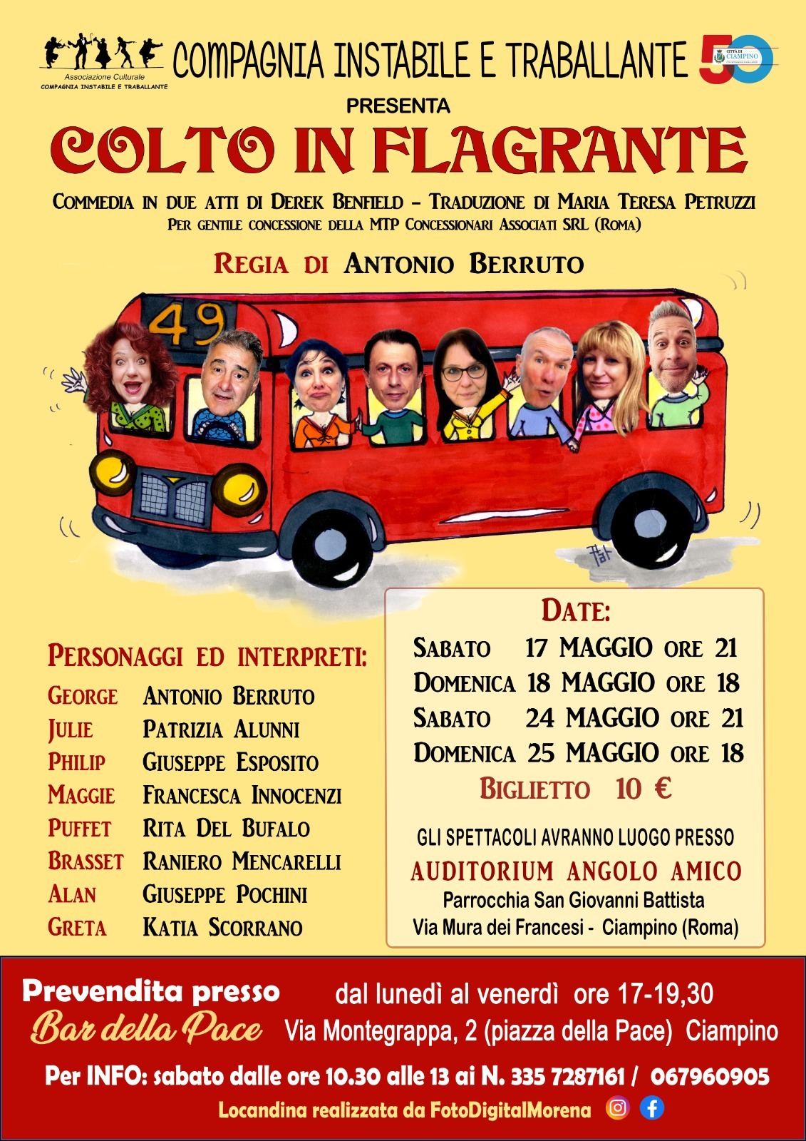 Domenica 25 maggio, dalle ore 18 si svolgerà lo spettacolo "Colto in flagrante", commedia in due atti di Derek Benfield, presso la parrocchia San Giovanni Battista in Via Mura dei Francesi (Auditorium Angolo Amico).