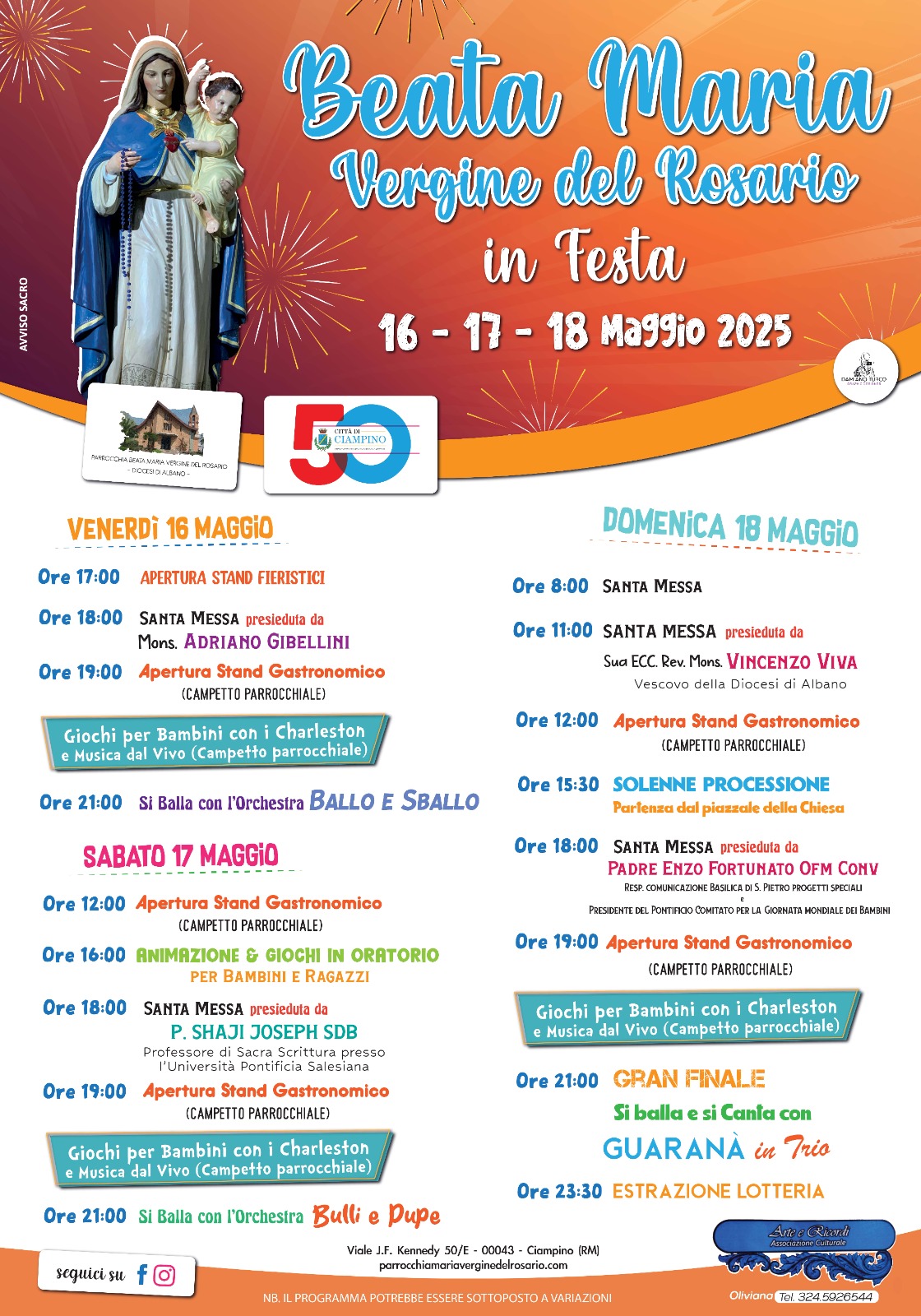 Dal 16 al 18 maggio appuntamento con la tradizionale festa della Beata Maria Vergine del Rosario nelle vie limitrofe l'omonima Parrocchia ubicata in viale Kennedy.