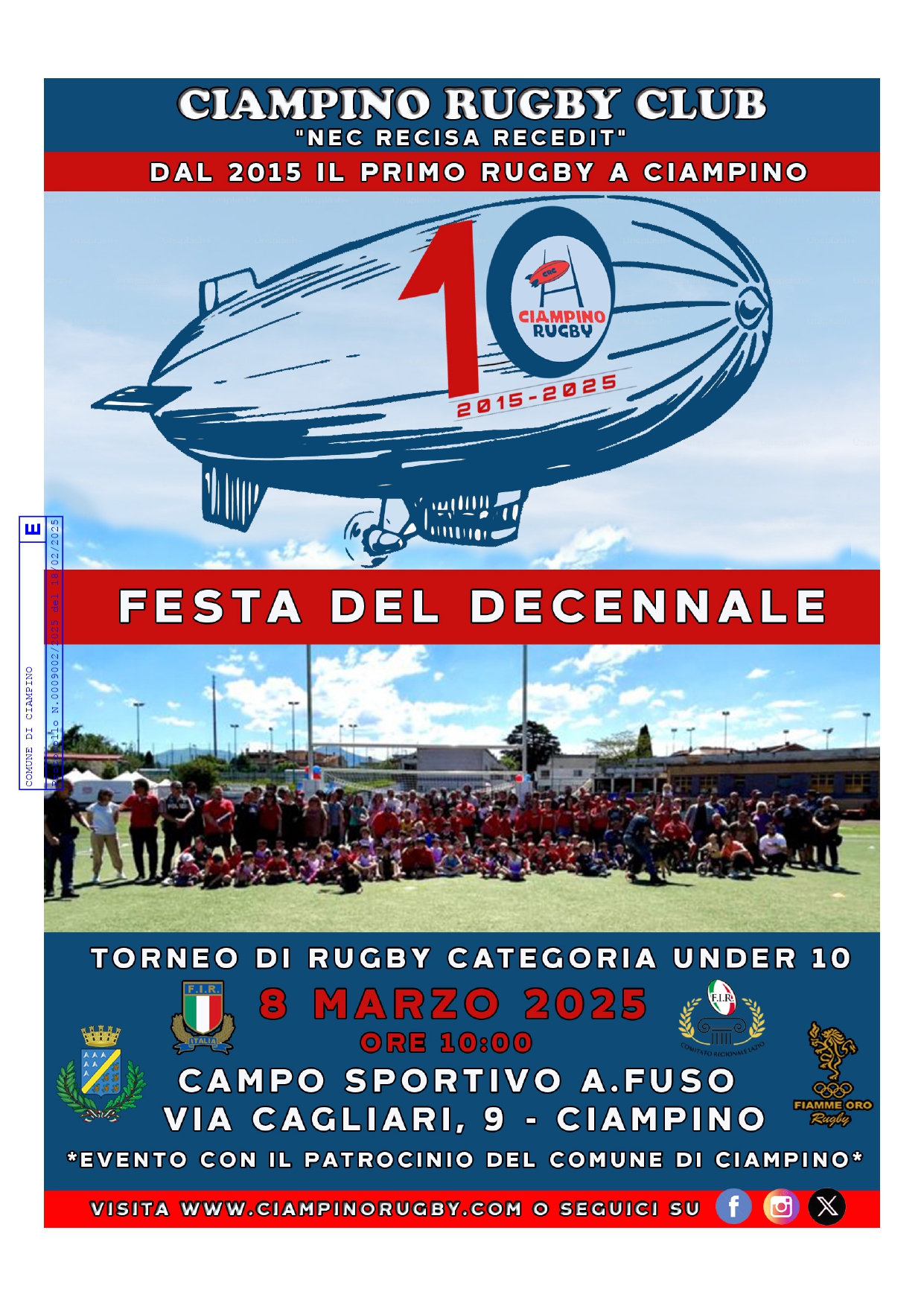 Sabato 8 marzo, alle ore 10:00, presso il campo sportivo A. Fuso Via Cagliari 9, si celebra la festa del decennale dell' ASD Ciampino Rugby Club con il patrocinio dell'Ente.