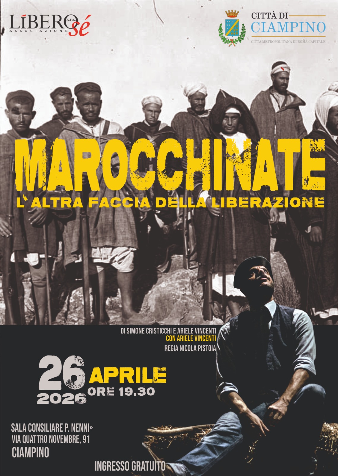 Domenica 26 aprile, alle ore 19.30, si terrà lo spettacolo teatrale "Marocchinate. L'altra faccia della Liberazione" a cura dell'associazione Libero Sè, presso la sala consiliare P. Nenni