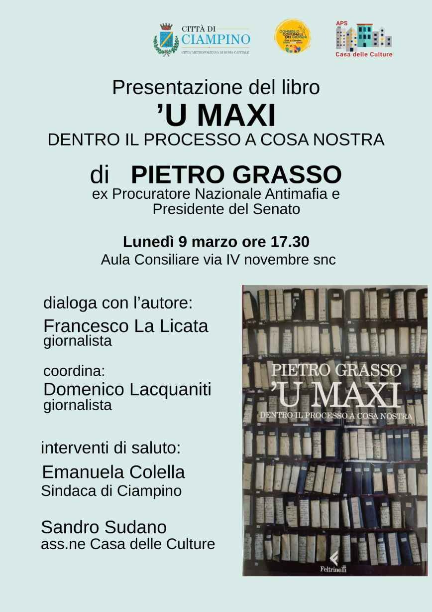 L'Associazione di Promozione Sociale "Casa delle Culture", con il patrocinio dell'Ente, presenta il libro di Pietro Grasso, Ex Procuratore Nazionale Antimafia e Presidente del Senato, intitolato "U Maxi - Dentro il processo di Cosa Nostra".