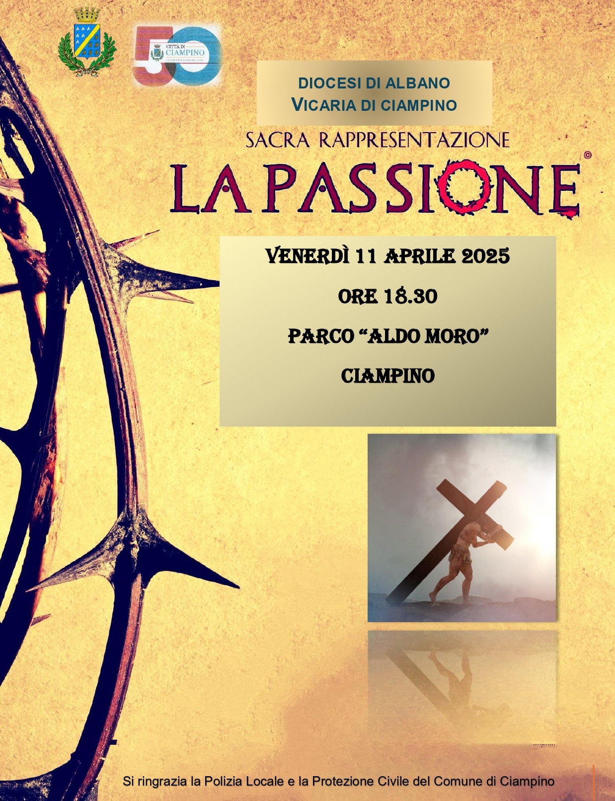 La Diocesi di Albano - Vicaria di Ciampino organizza, con il patrocinio del Comune, la rappresentazione della “Passione di nostro signore Gesù Cristo” venerdì 11 aprile dalle ore 18.30 presso Parco Aldo Moro.