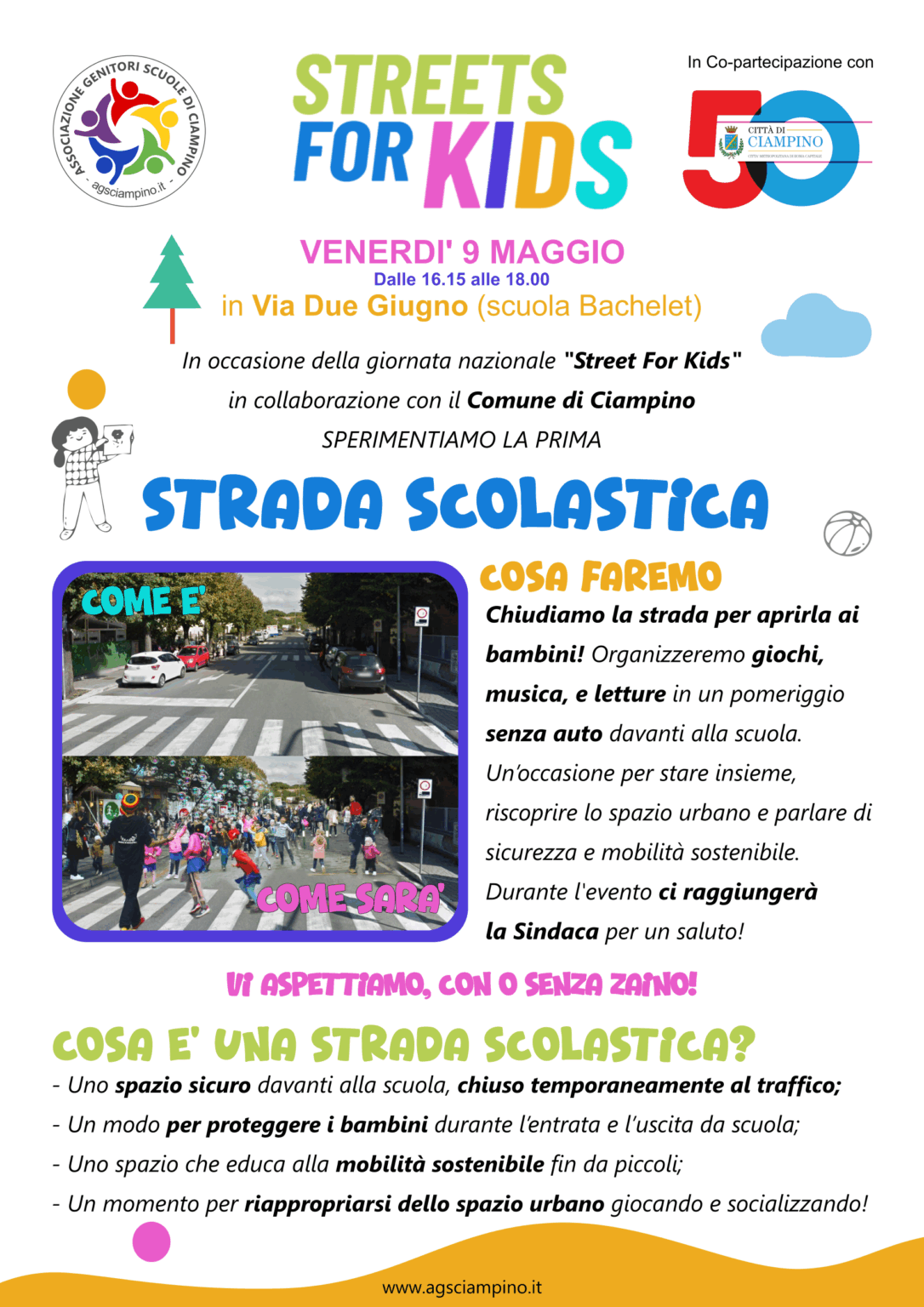 Venerdì 9 maggio, dalle ore 15:45 alle ore 18:00 , nel tratto stradale antistante l’Istituto scolastico “V. Bachelet”, si svolgerà la manifestazione "Street for Kids" organizzata dall'Associazione dei Genitori delle Scuole di Ciampino e patrocinata dall'Ente.