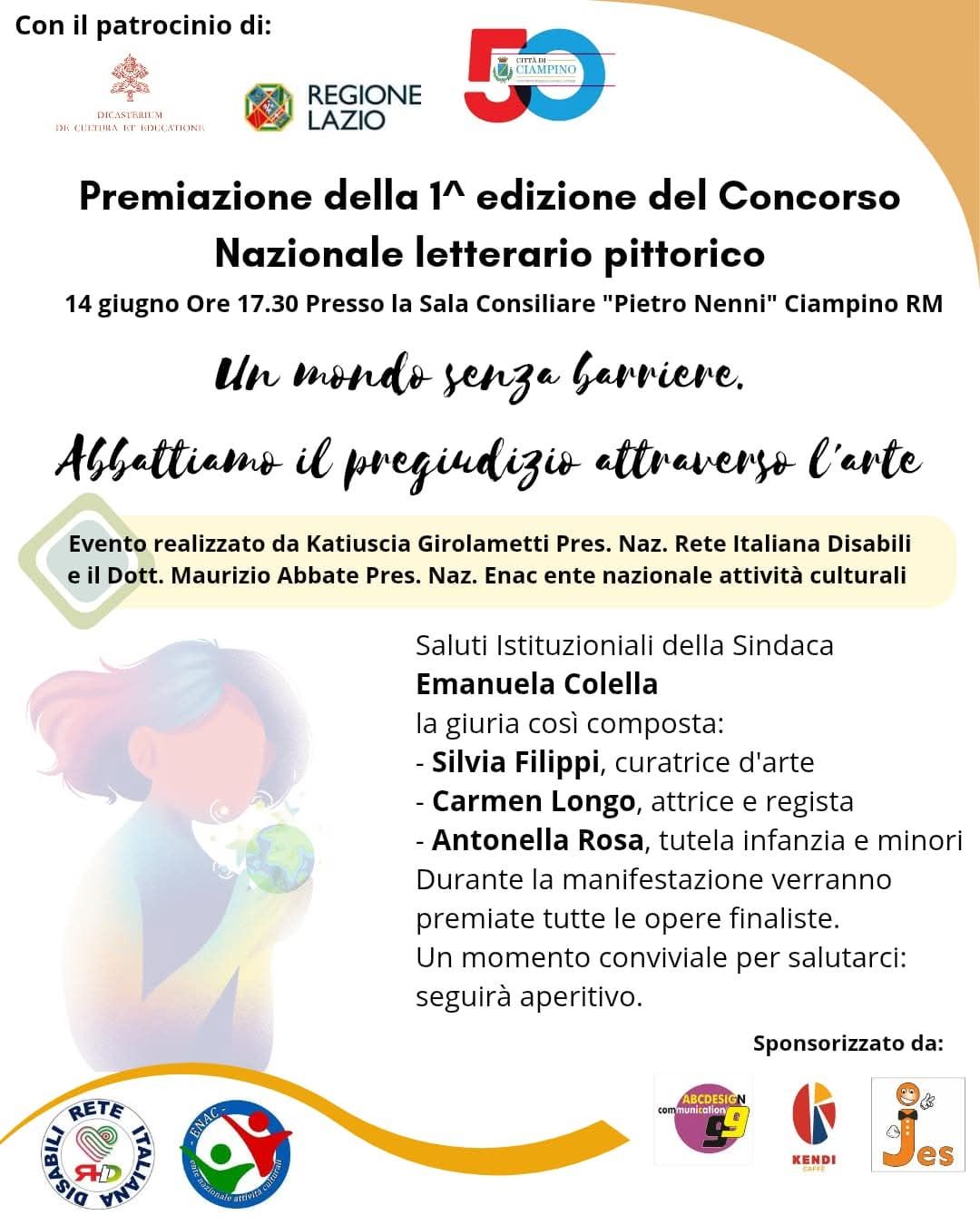 Sabato 14 giugno si terrà la premiazione della 1ª Edizione del Concorso Nazionale Letterario-Pittorico "Un mondo senza barriere. Abbattiamo il pregiudizio attraverso l’arte".
