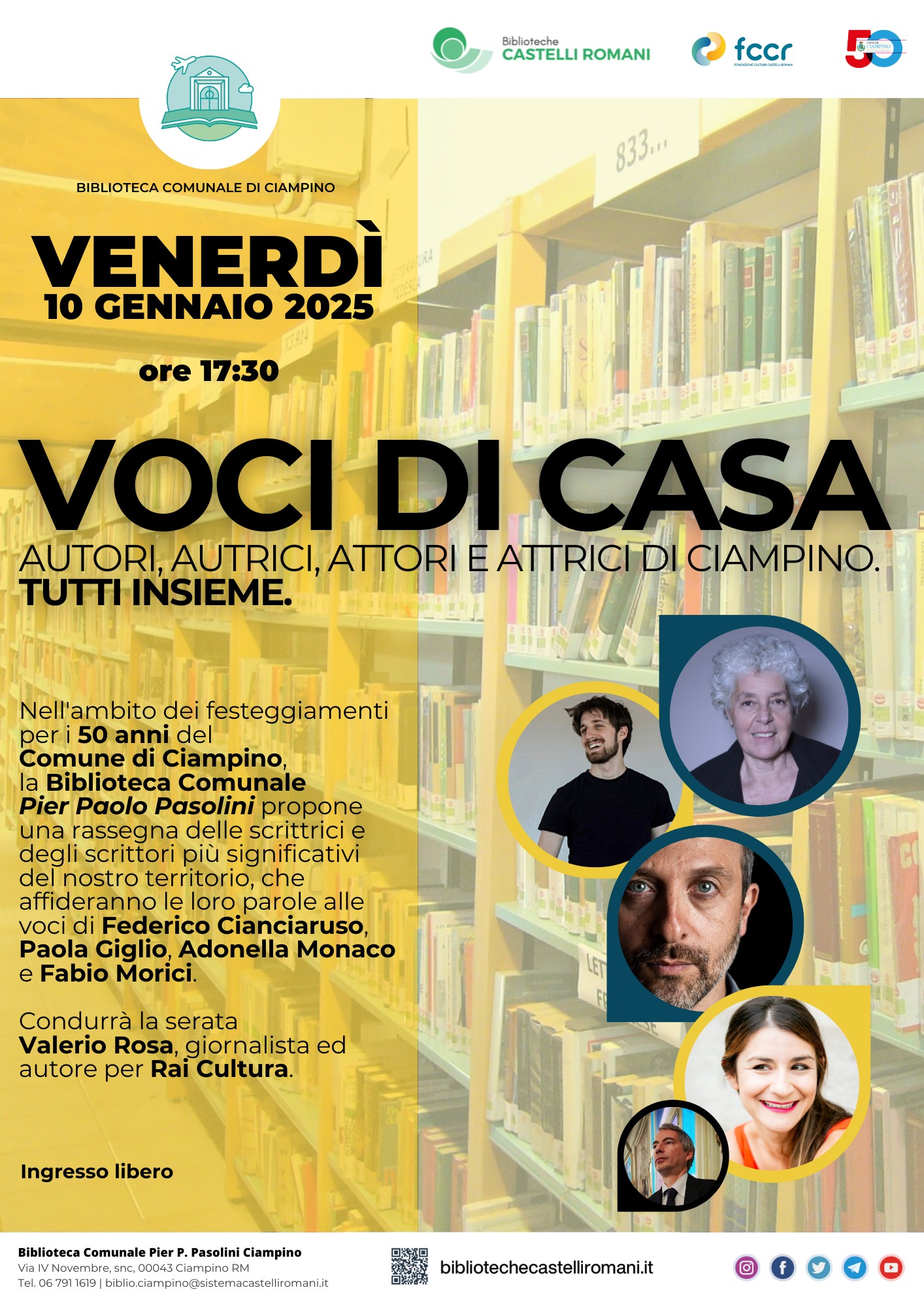 Nell'ambito delle celebrazioni del 50esimo anniversario del Comune di Ciampino, la Biblioteca comunale Pier Paolo Pasolini promuove una rassegna delle scrittrici e degli scrittori più significativi del nostro territorio, che affideranno le loro parole alle voci di Federico Cianciaruso, Paola Giglio, Simone Liberati, Adonella Monaco, Fabio Morici.