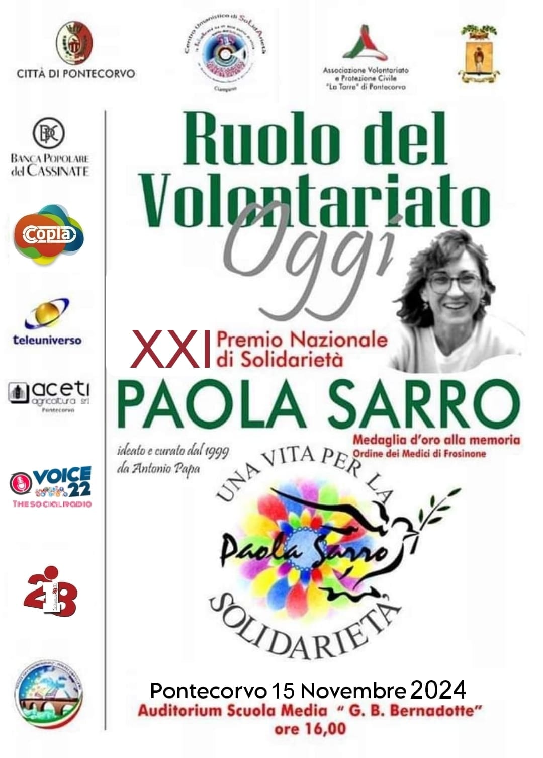 Venerdì 15 novembre la consegna del Premio Nazionale di Solidarietà “Paola Sarro” all’Ente