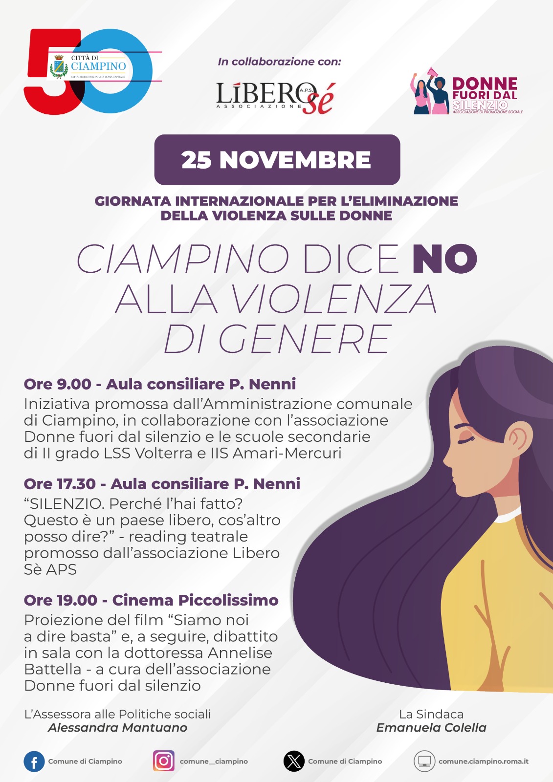 - Ore 9.00 presso la sala consiliare P. Nenni con l'incontro-dibattito "Ciampino dice NO alla violenza di genere" promosso dall’Amministrazione comunale con l’associazione Donne fuori dal silenzio e le scuole secondarie di secondo grado LSS Volterra e IIS Amari-Mercuri. L’evento mira a sensibilizzare i più giovani sulla necessità di promuovere il rispetto e l’uguaglianza di genere.