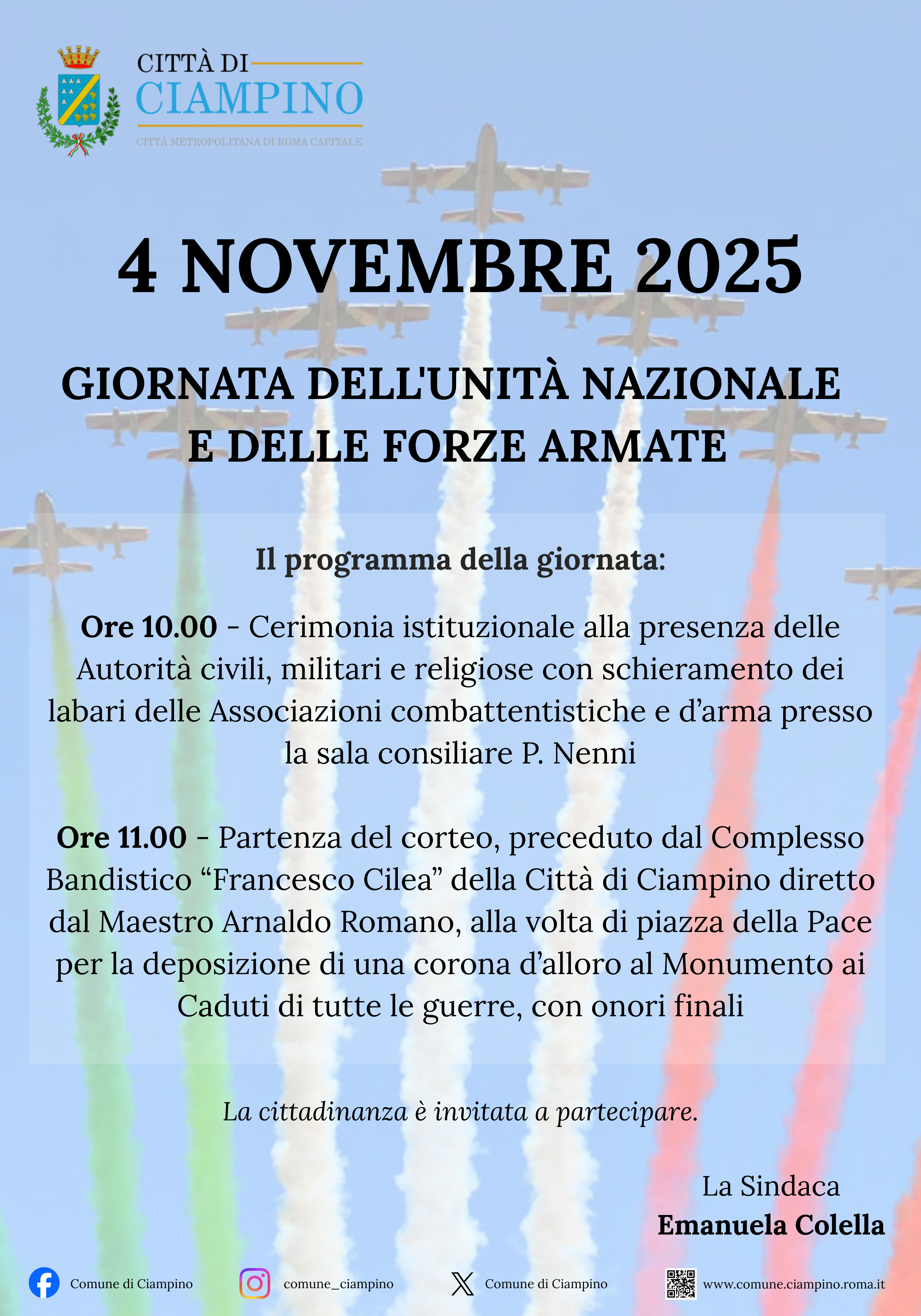 Martedì 4 novembre 2025 il Comune di Ciampino celebra la Giornata dell'Unità Nazionale e delle Forze Armate, ricordando il sacrificio di quanti hanno combattuto e perso la vita per la difesa dei valori della libertà.