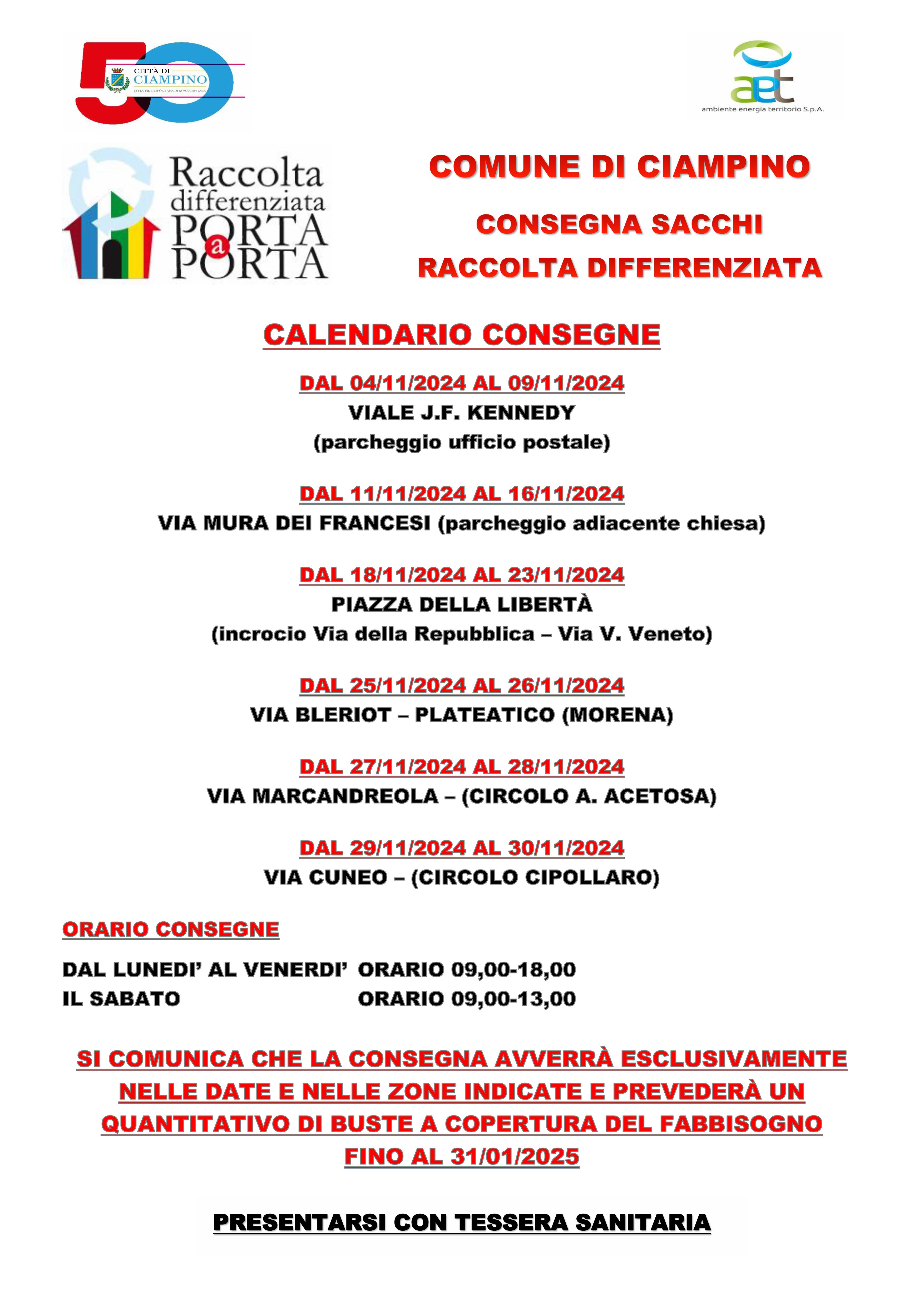 Si comunica che la consegna avverrà esclusivamente nelle date e nelle zone indicate e prevederà un quantitativo di buste a copertura del fabbisogno fino al 31 gennaio 2025.