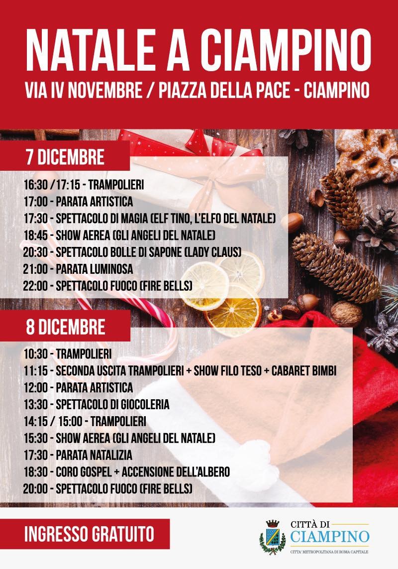 Domenica 7 dicembre e lunedì 8 dicembre, in Via IV Novembre e in Piazza della Pace, si terrà l'evento "Natale a Ciampino".