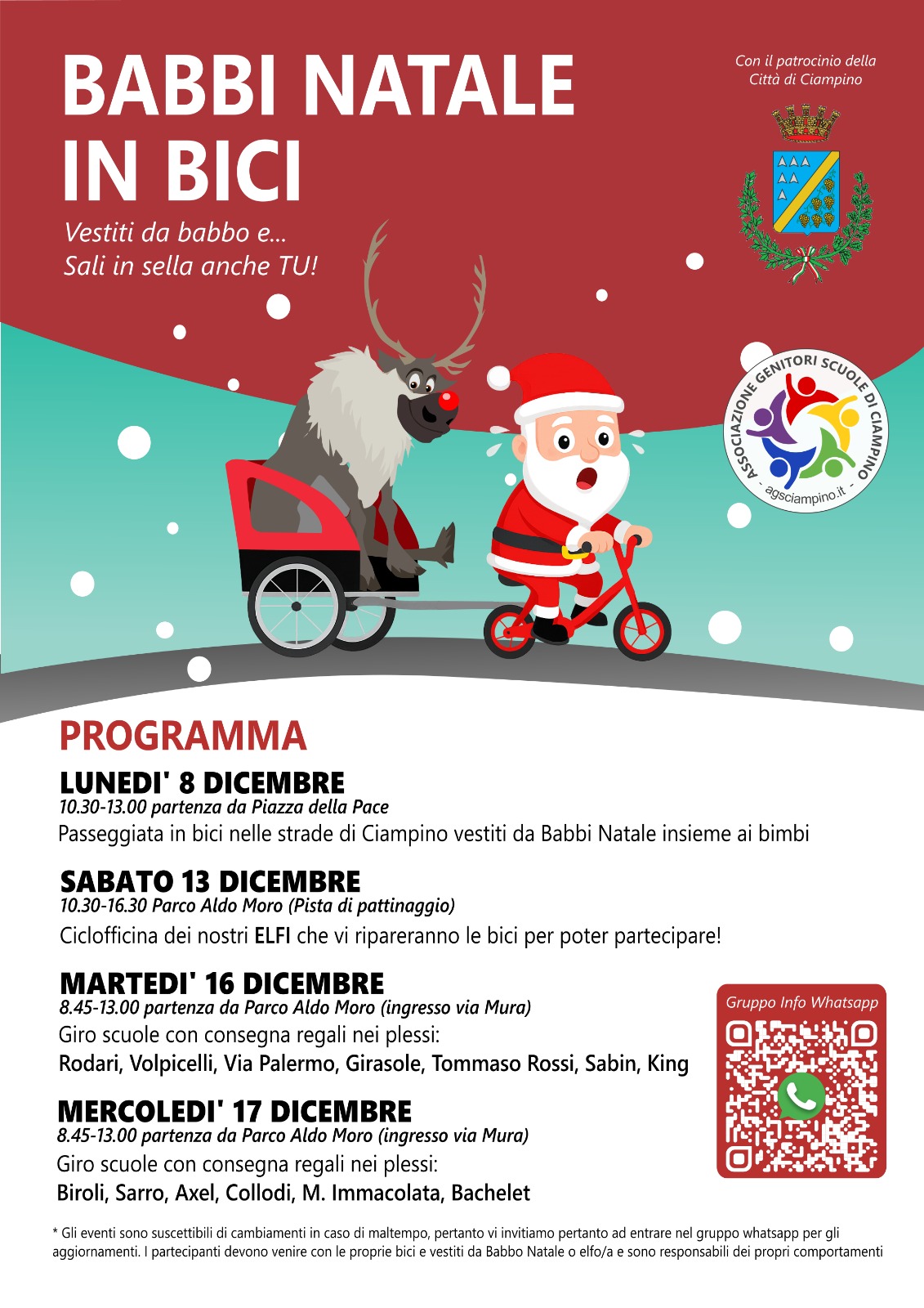 L'Associazione Genitori Scuole Ciampino, con il patrocinio della Città di Ciampino, organizza "Babbi Natale in bici", una serie di eventi per festeggiare insieme l'arrivo del Natale.