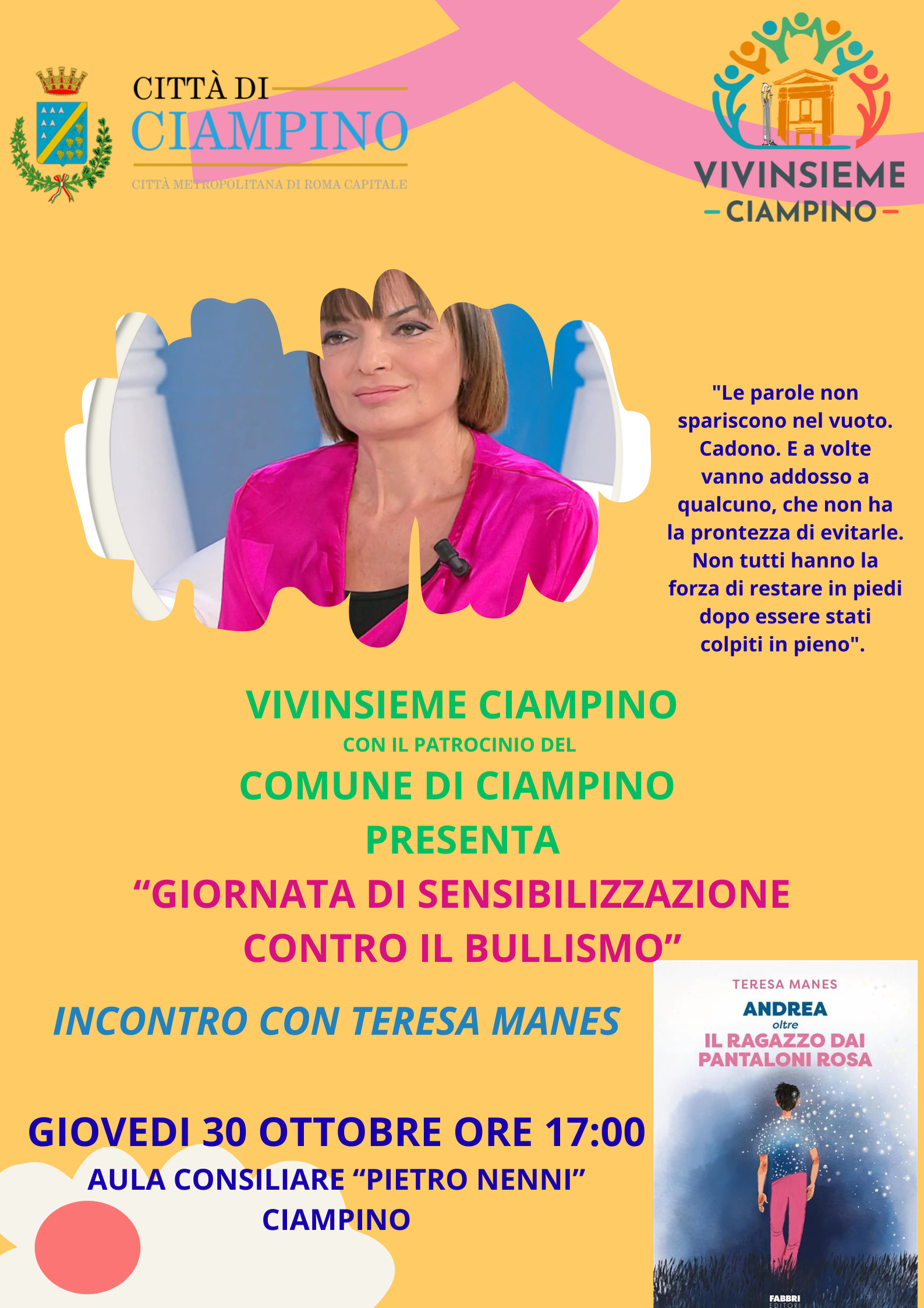 L'evento si terrà giovedi 30 ottobre alle ore 17:00 presso la sala consiliare P. Nenni e vedrà la partecipazione di Teresa Manes, autrice del libro "Andrea, oltre il ragazzo dai pantaloni rosa".