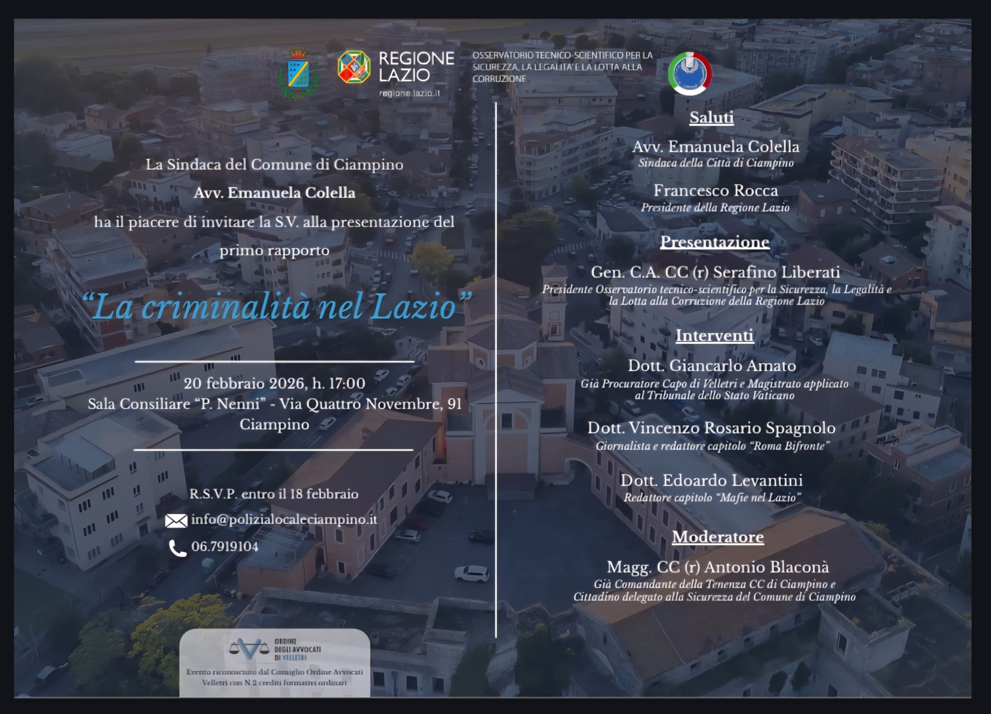 L'evento è organizzato da Comune di Ciampino e Comando di Polizia locale, in collaborazione con l’Osservatorio tecnico-scientifico per la sicurezza, la legalità e la lotta alla corruzione della Regione Lazio e l’Ordine degli Avvocati di Velletri.