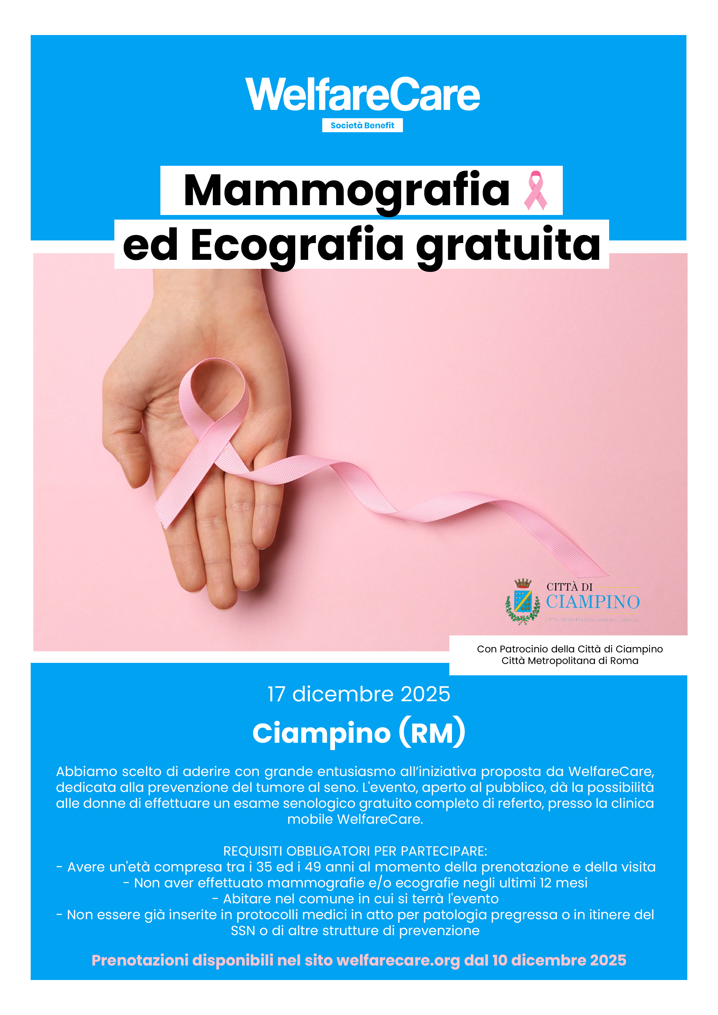 Il Comune di Ciampino, come partner dell’iniziativa proposta da WelfareCare dedicata alla prevenzione del tumore al seno, lancia una giornata dedicata alla prevenzione.