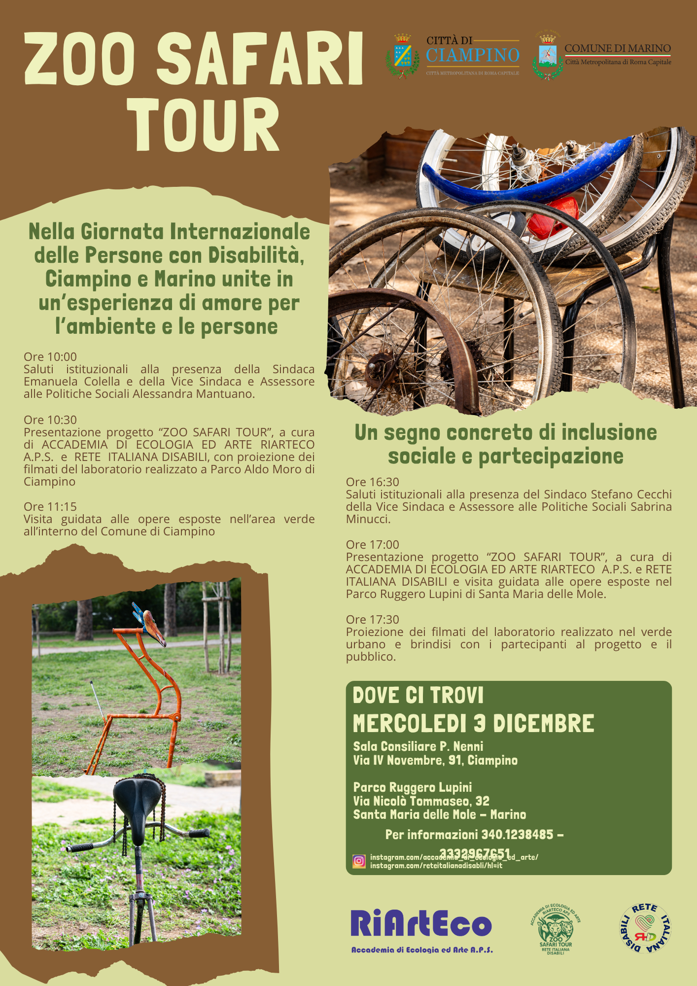 Mercoledì 3 dicembre, in occasione della Giornata internazionale delle persone con disabilità, con l'evento di restituzione in programma nei Comuni di Ciampino e Marino, si chiude Zoo Safari Tour, il progetto artistico, sociale e ambientale promosso da Accademia di Ecologia e Arte Riarteco APS e Rete Italiana Disabili, con il contributo del Distretto Socio Sanitario Ciampino-Marino RM 6.3 e il supporto di CSV Lazio ETS.