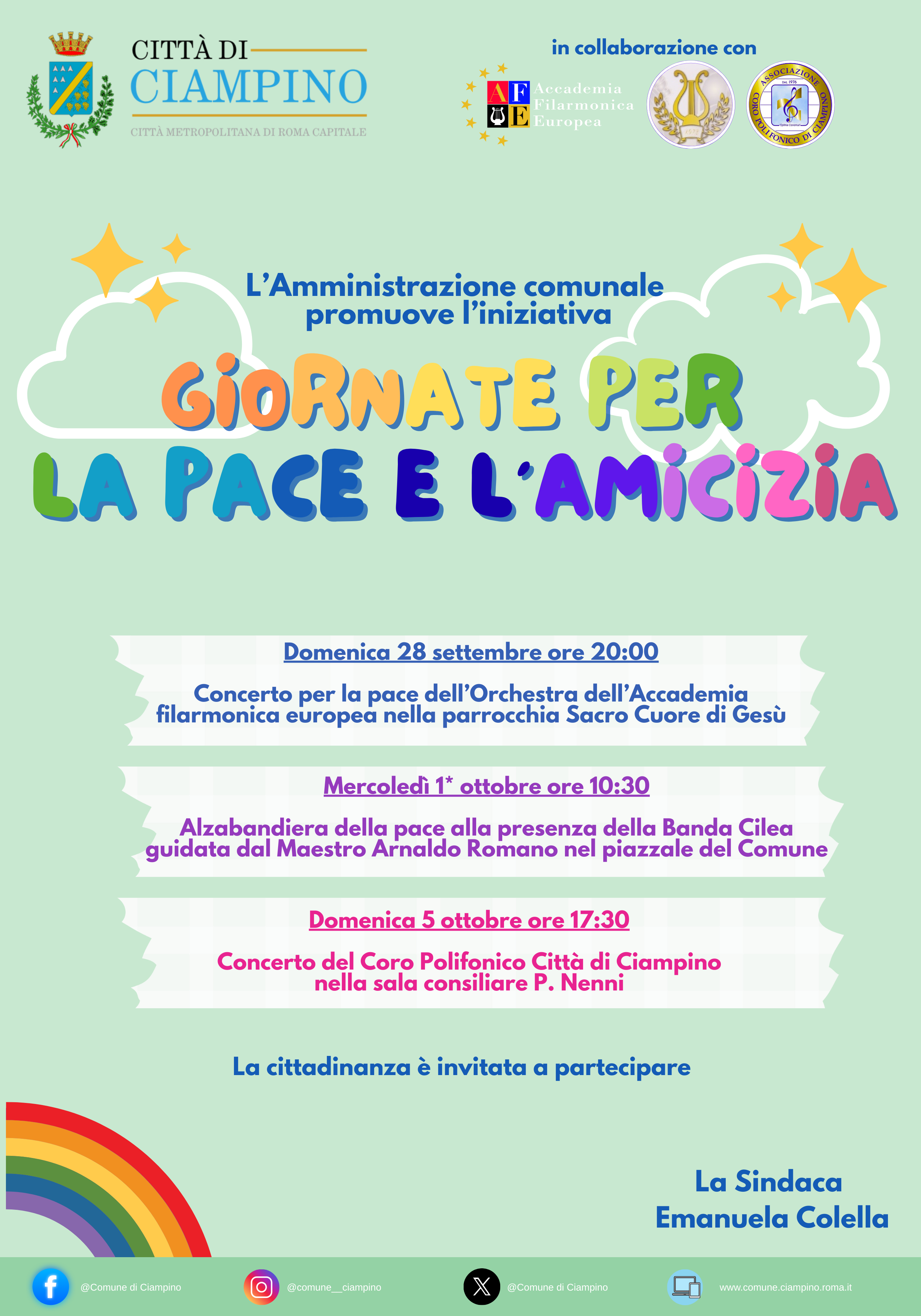 Anche quest’anno è in programma un calendario di iniziative che si aprirà domenica 28 settembre con il concerto dell’Orchestra dell'Accademia filarmonica europea nella parrocchia Sacro Cuore di Gesù. Mercoledì 1* ottobre, in occasione della giornata cittadina istituita per la pace e l’accoglienza, si terrà la consueta cerimonia dell’alzabandiera della pace nel piazzale comunale alla presenza della Banda Cilea guidata dal Maestro Arnaldo Romano. Terzo appuntamento domenica 5 ottobre con un concerto del Coro Polifonico Città di Ciampino in sala consiliare.