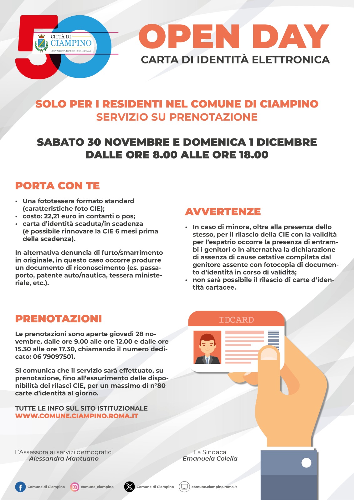 Open day Carta d’Identità Elettronica: sabato 30 novembre e domenica 1 dicembre 2024 Apertura straordinaria dell’ufficio Anagrafe del Comune di Ciampino sabato 30 novembre e domenica 1 dicembre dedicata al solo rilascio della Carta d’Identità Elettronica per i cittadini residenti a Ciampino. L’ufficio preposto sarà aperto dalle ore 8.00 alle ore 18.00 con orario continuato. “Visto il riscontro positivo delle aperture di marzo e aprile, abbiamo deciso di proporre due giornate di apertura straordinaria sabato 30 novembre e domenica 1 dicembre dalle ore 8.00 alle ore 18.00. L’accesso sarà consentito previa prenotazione – spiegano la Sindaca Emanuela Colella e l’Assessora ai Servizi demografici Alessandra Mantuano – Vogliamo rispondere concretamente alle esigenze dei nostri cittadini, agevolando l’accesso ai servizi digitali e al tempo stesso riducendo i tempi d’attesa per garantire una pubblica amministrazione efficiente e veloce”.