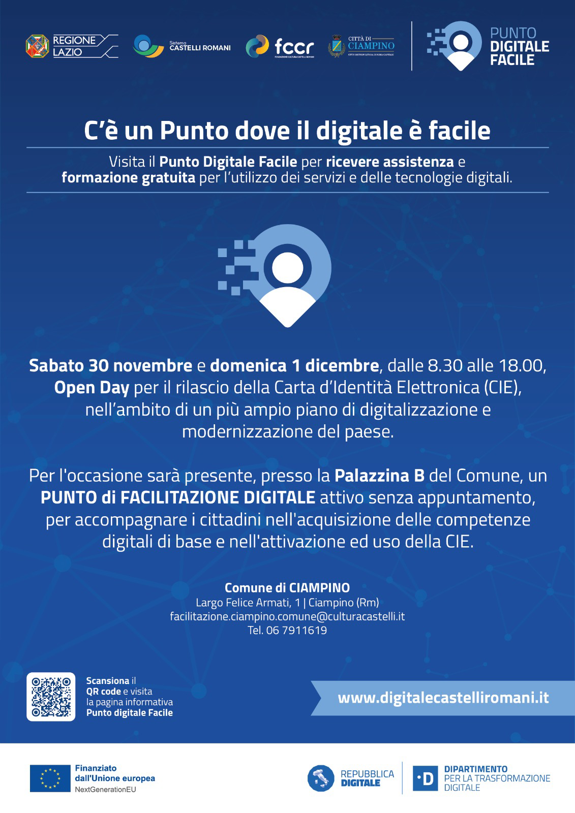 Durante gli open day sarà disponibile, dalle ore 8.30 alle ore 18.00, senza prenotazione, un punto di facilitazione digitale per aiutare i cittadini all’acquisizione delle competenze digitali di base e nell’attivazione e uso della CIE.