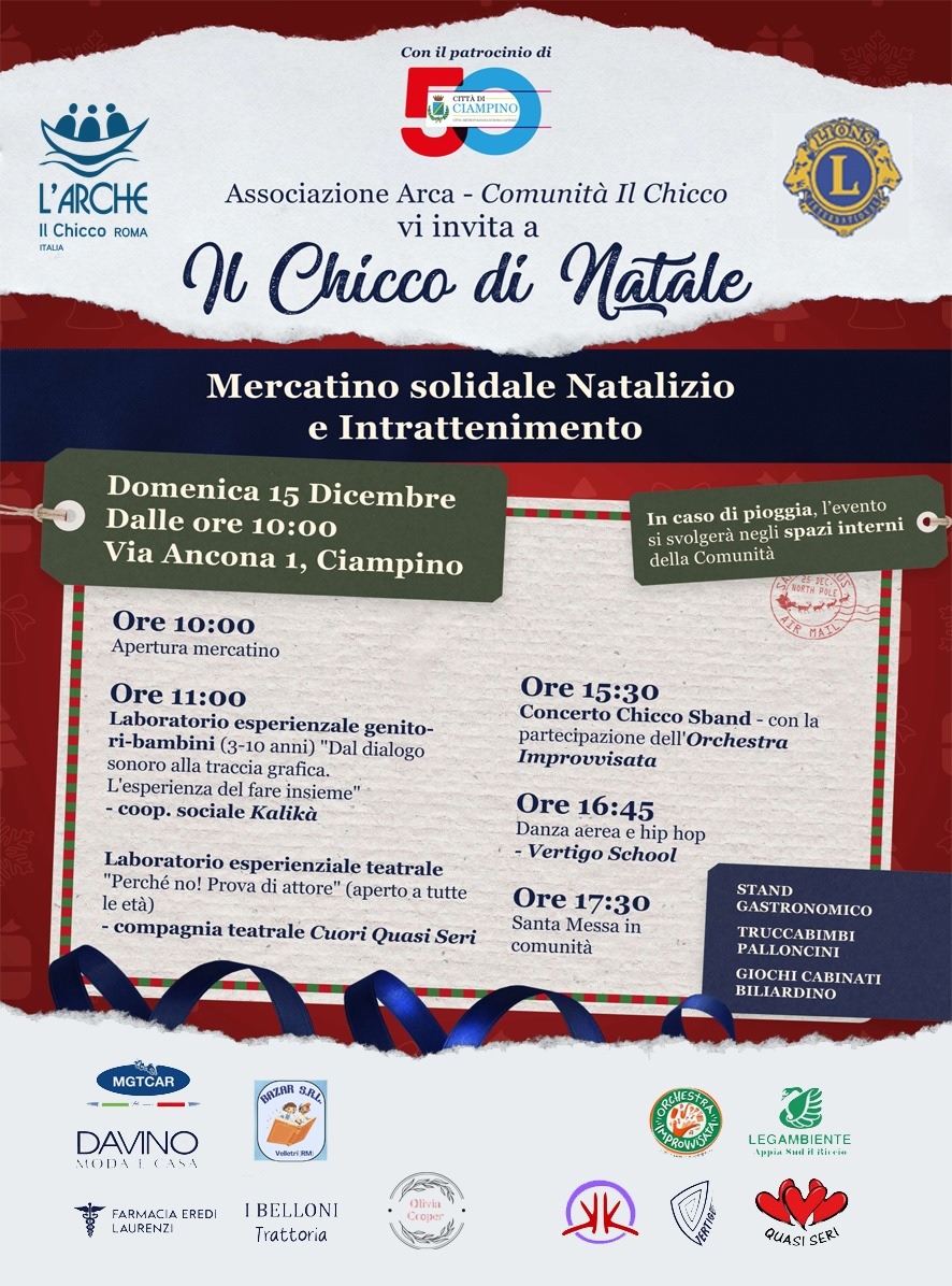 | 15 dicembre | Il Chicco di Natale - iniziativa solidale presso la sede dell’associazione Arca comunità il Chicco | Dalle ore 10.00 Sede Il Chicco (via Ancona, 1) |